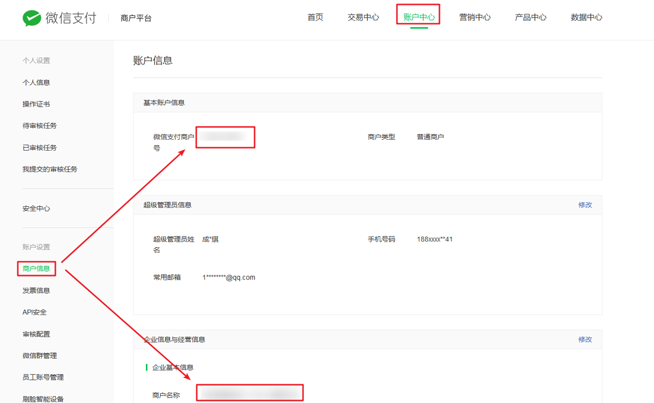 商户号/商户名称查看路径:商户平台-账户中心-商户信息中查看。如下图: