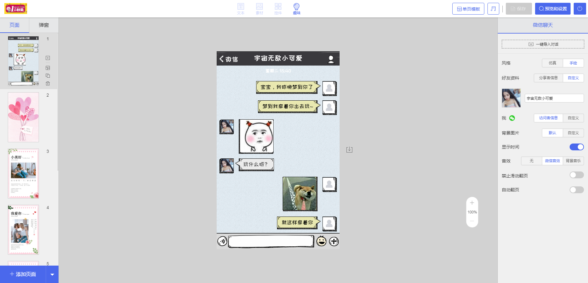 点击导航栏左侧图标回到管理平台;中间分别为:文本,素材,控件,趣味功能;右侧分别为:单页模板,音乐,保存,预览和设置,关闭。