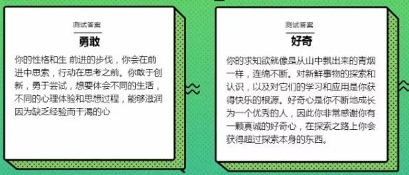 测试结果无疑是决定用户分享与否最重要的一环。在结果的撰写中,我们可以遵循“标签化+对标签的趣味性/夸张性/ 文艺性阐述”这一原则来呈现。譬如当你想夸用户有文艺气质的时候,标签是“城市诗人”+“钢筋水泥的丛林里,你只想抬头望见月亮”。