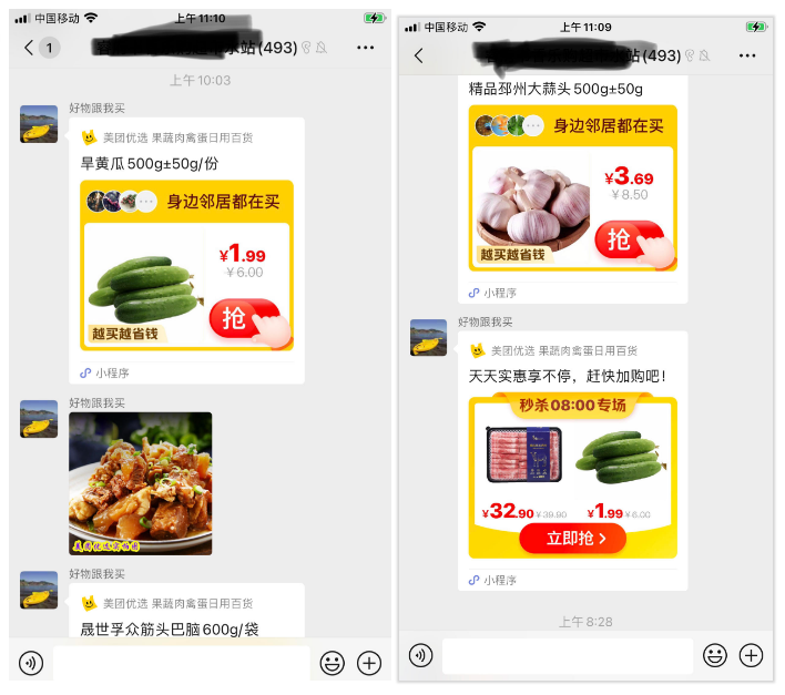 这三类链接很固定,一个是秒杀物品窗口,一个是批量打折物品窗口,一个是秒杀对应时间特殊事件首页,偶尔会有商品微调图片。整个过程都是定向消息推送。但美团优选集团官方代表入团后,同样是几个集团负责人的老组长不再主动为美团优选集团推荐产品。