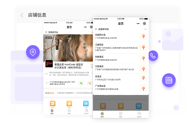 总部灵活设置服务、卡项上架门店,统一策划和发布营销活动,并按门店筛选并监控预约订单。根据地理位置推荐附近门店,门店列表自由切换,支持门店统一品牌风格。实时获取订单并处理,店员权限灵活配置,可独立设置门店客服。