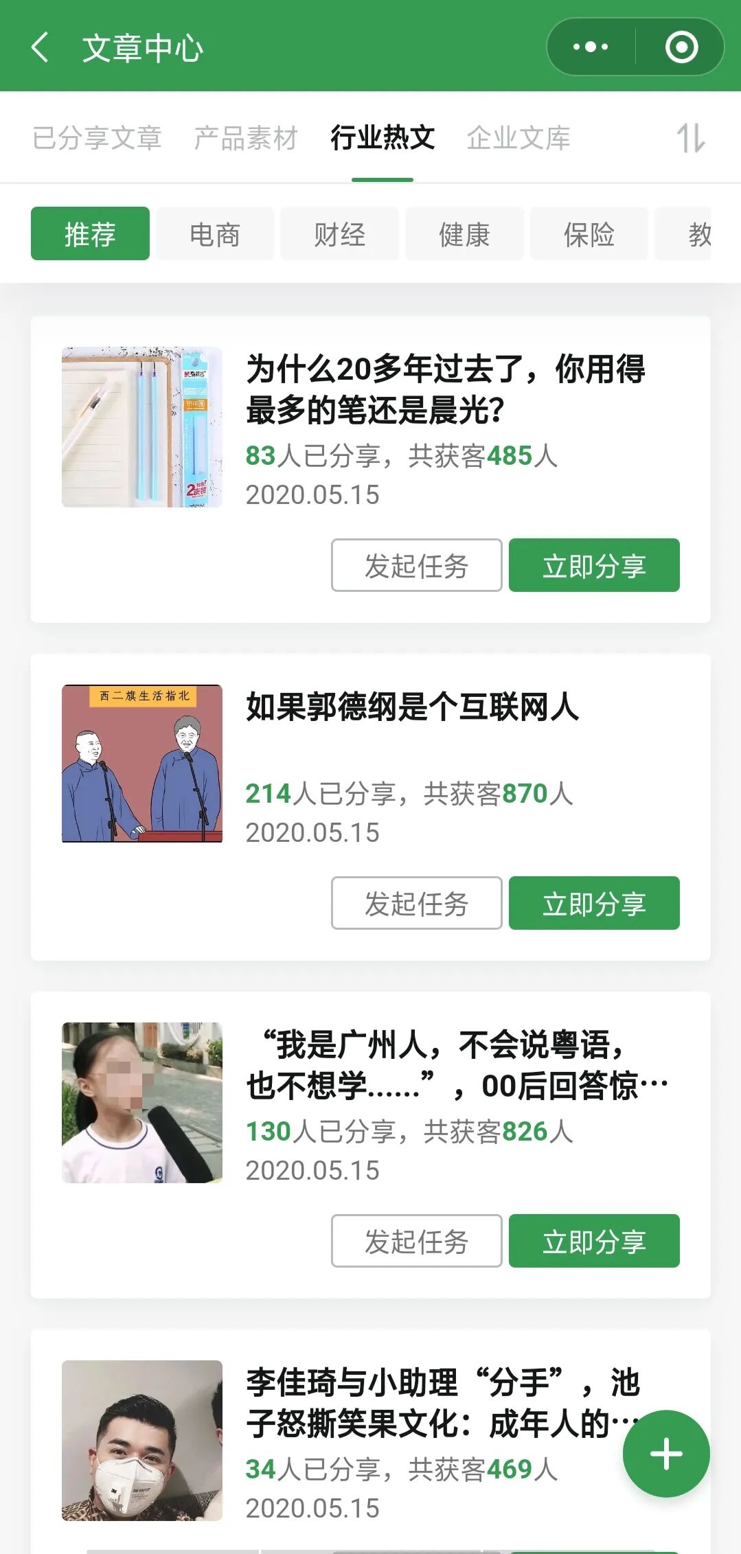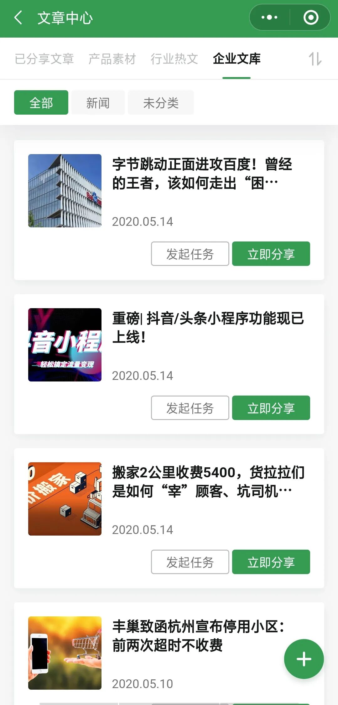 销售系统的获客文章功能,海量产品素材(行业热文)、行业热文定期更新,您只需一键分享,即可让托载了您广告的精品内容为您传播获客,也可以自己写作(企业文库)进行分享。