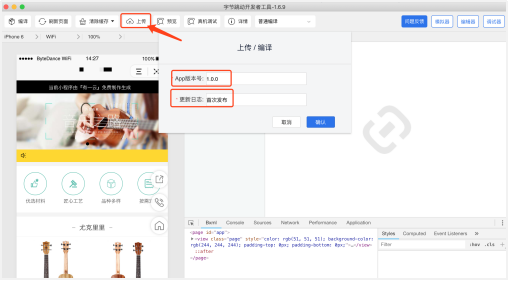 2. 下载并安装字节跳动小程序开发者工具,用在字节跳动开发者平台注册过的手机号进行登录,导入解压过的代码包,在【上传】中填写版本号以及更新日志。