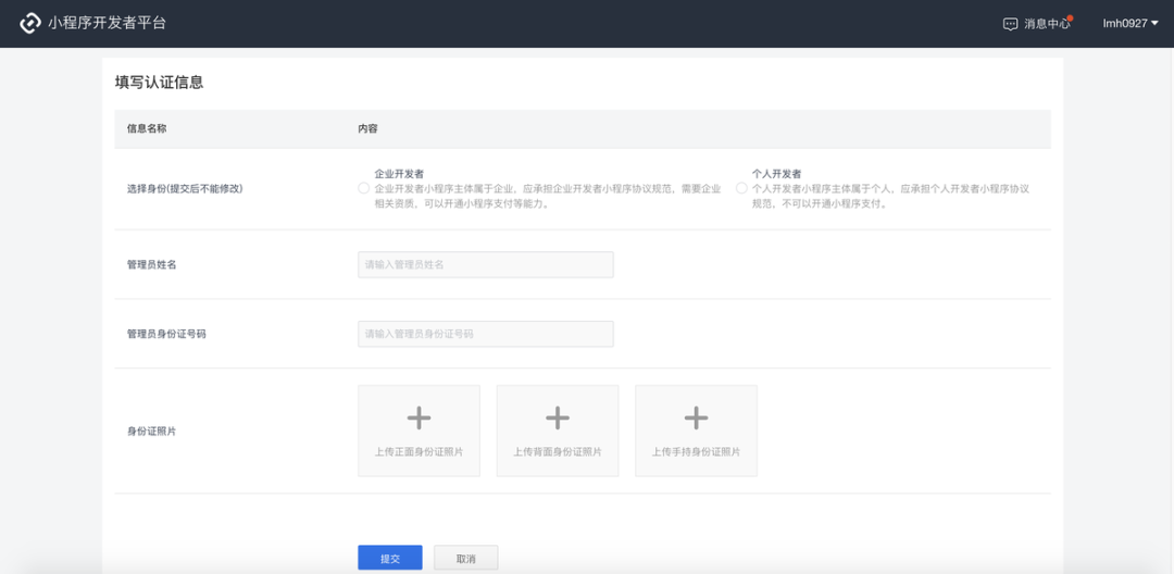 - 个人开发者认证: 只需要填写管理员信息。