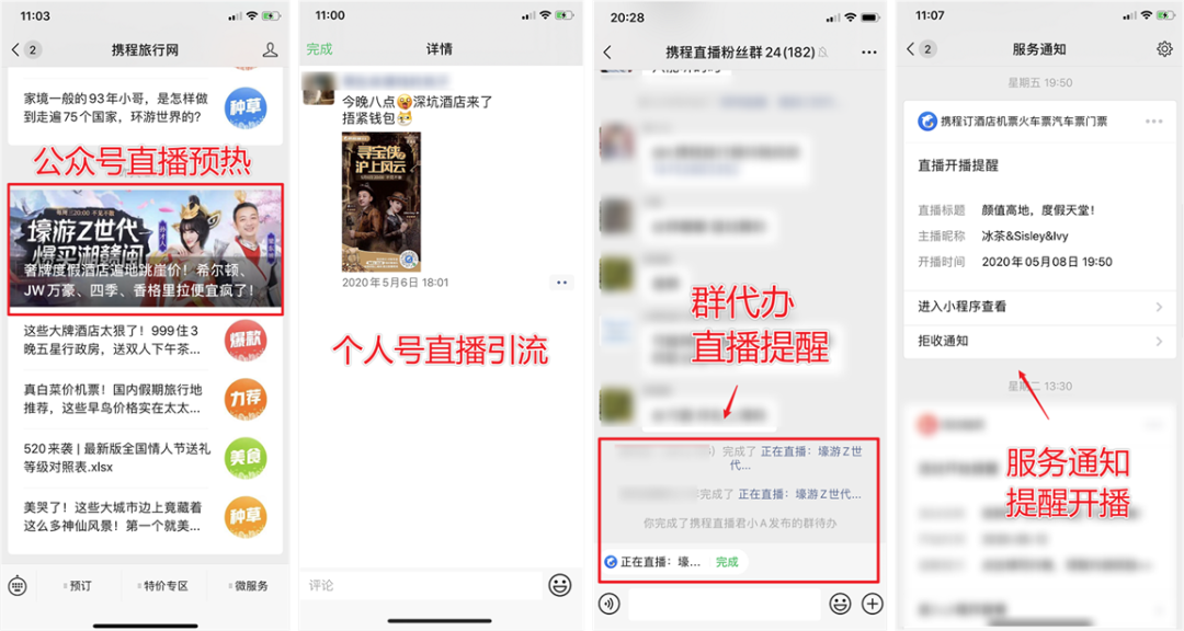 直播开始时,携程在自己的粉丝社群里发布群公告,设置群待办;公众号发布消息模板,通知用户直播开始;通过“服务通知”,在会话主页面对已经订阅直播的用户进行强提醒。