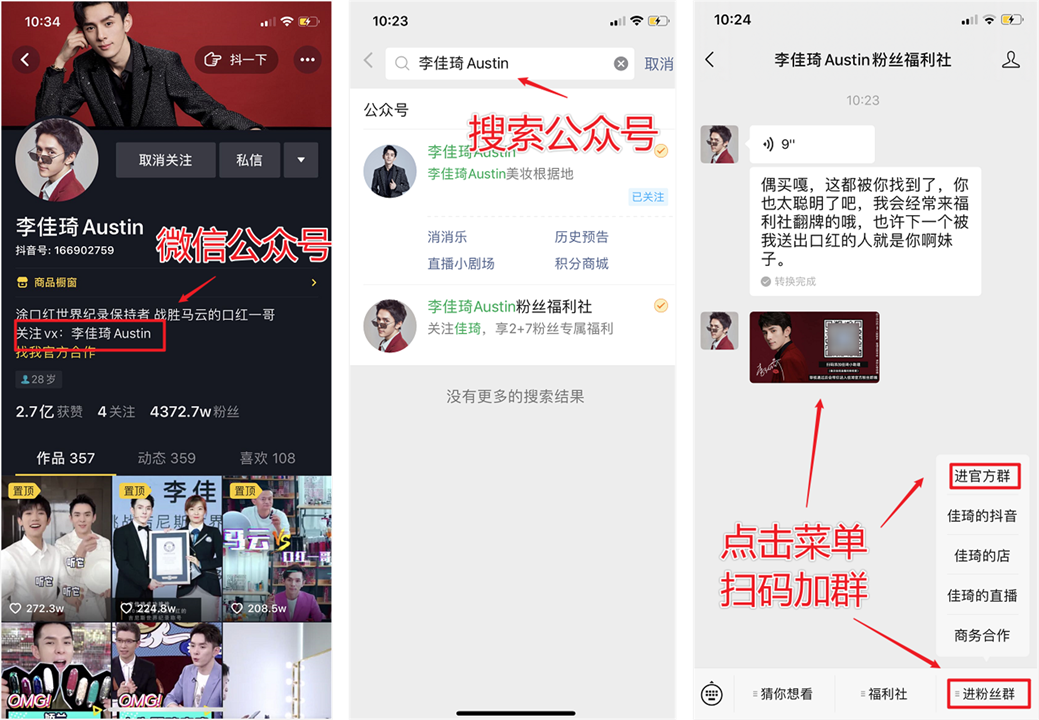 第二,用户加群的操作特别复杂,门槛高。比如你在李佳琦抖音主页的个人简介里找到了微信号,需要跳转到微信App搜索公众号,关注后还需要多个步骤进群。