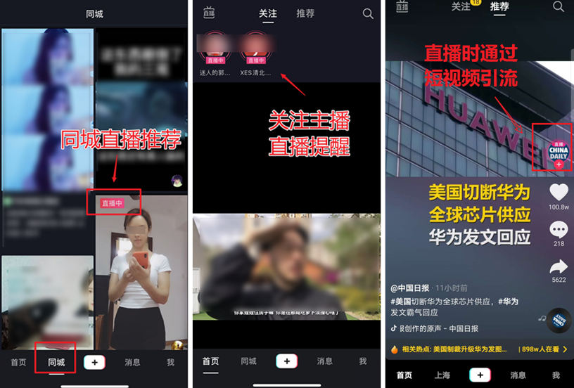 “关注”界面进入直播间的流量,取决于账号有多少粉丝。要通过长期的内容运营来积累粉丝,并不容易。从直播广场和同城推荐进入的流量,来自于系统推荐,我们没法主动提高这些渠道的流量。