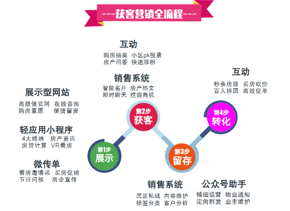 首先,给大家分享的是房地产行业线上营销解决方案↑离不开以下几个大环节:企业品牌展示——获客——留存——转化