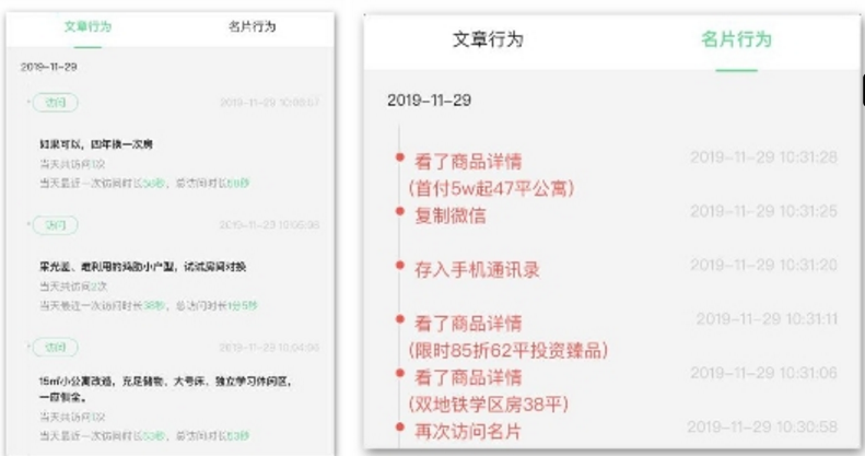 此外,销售系统-获客文章功能,自带房地产行业的热文库,企业无需花费人力专门创作内容,一键转化即可推给目标用户,通过后台监控,即可顺利发掘哪些用户看了,文章停留时长,实现精准获客。