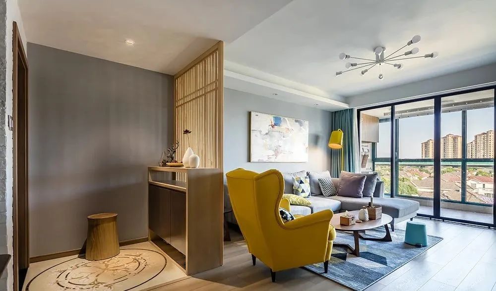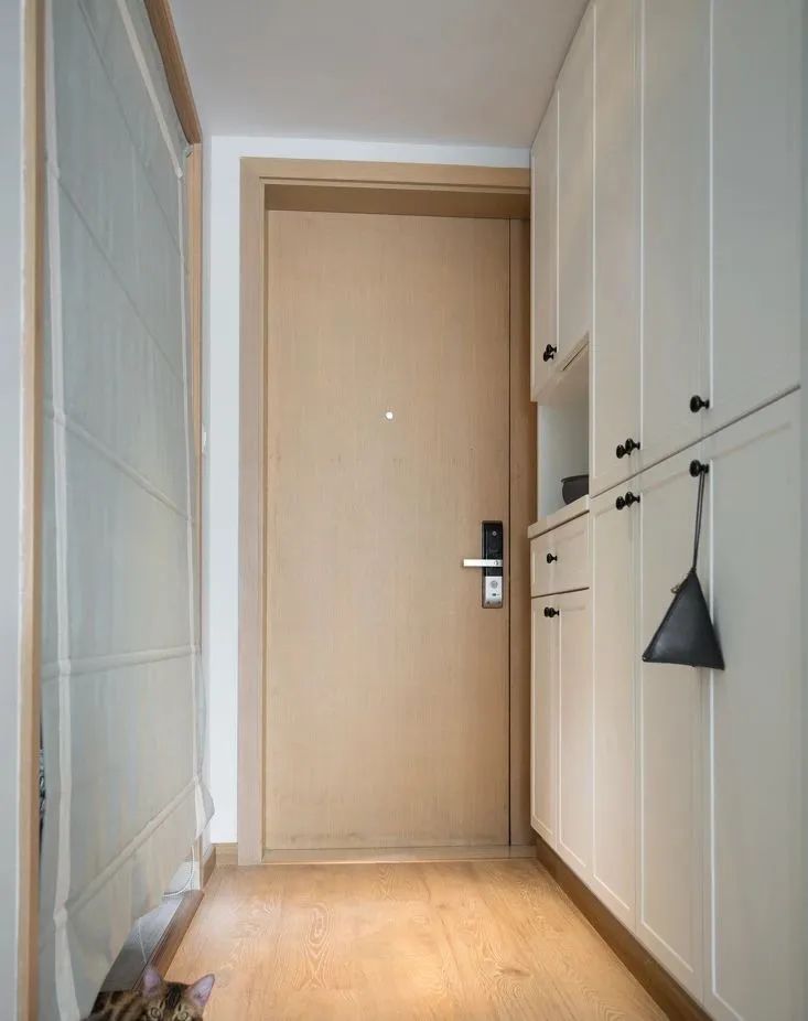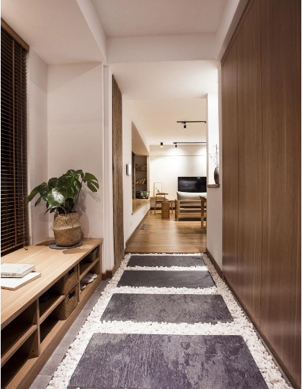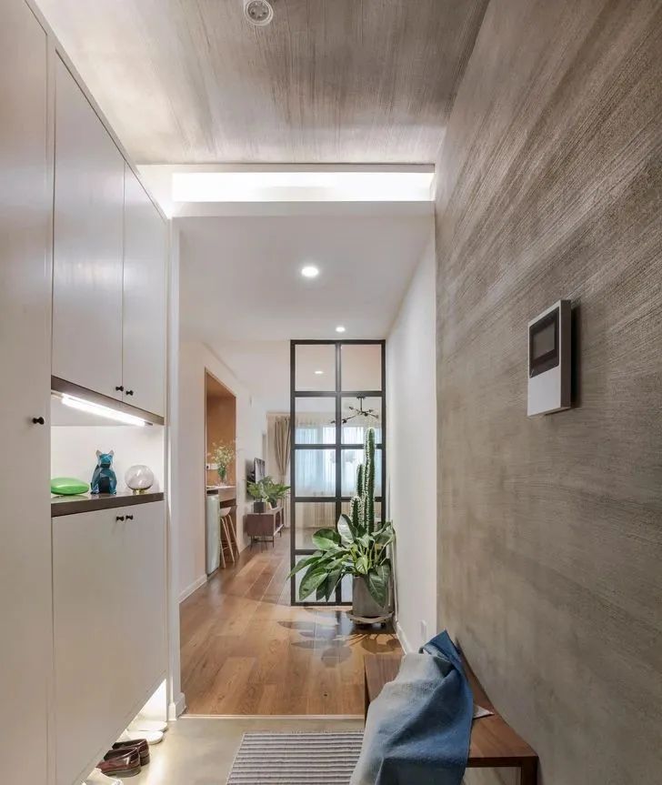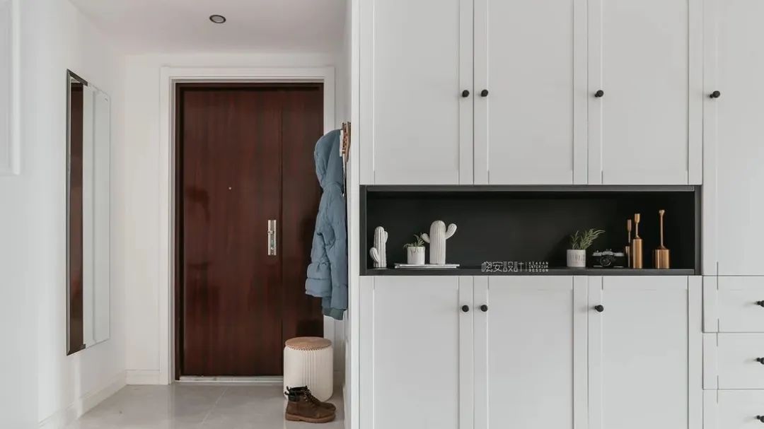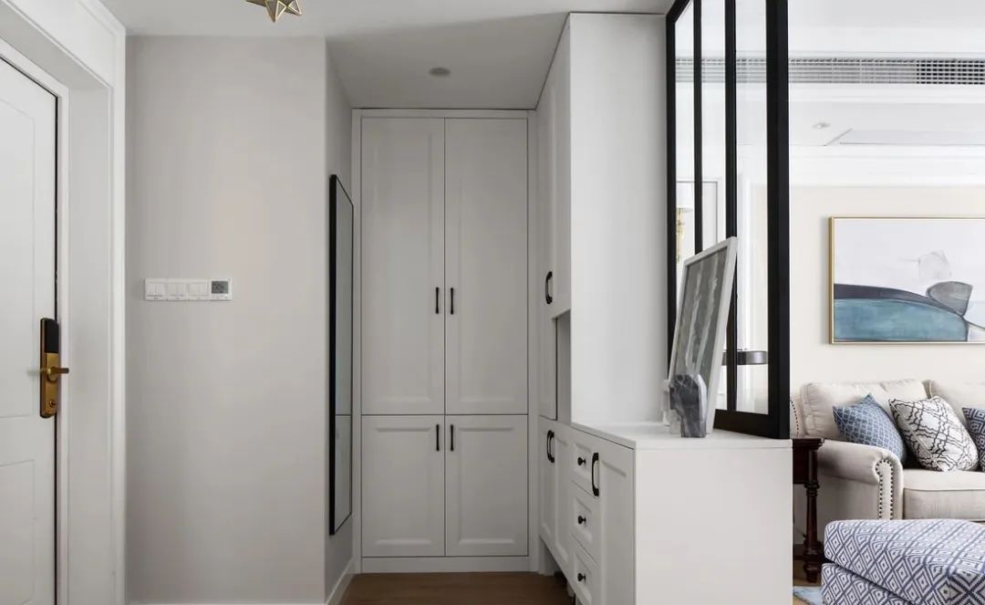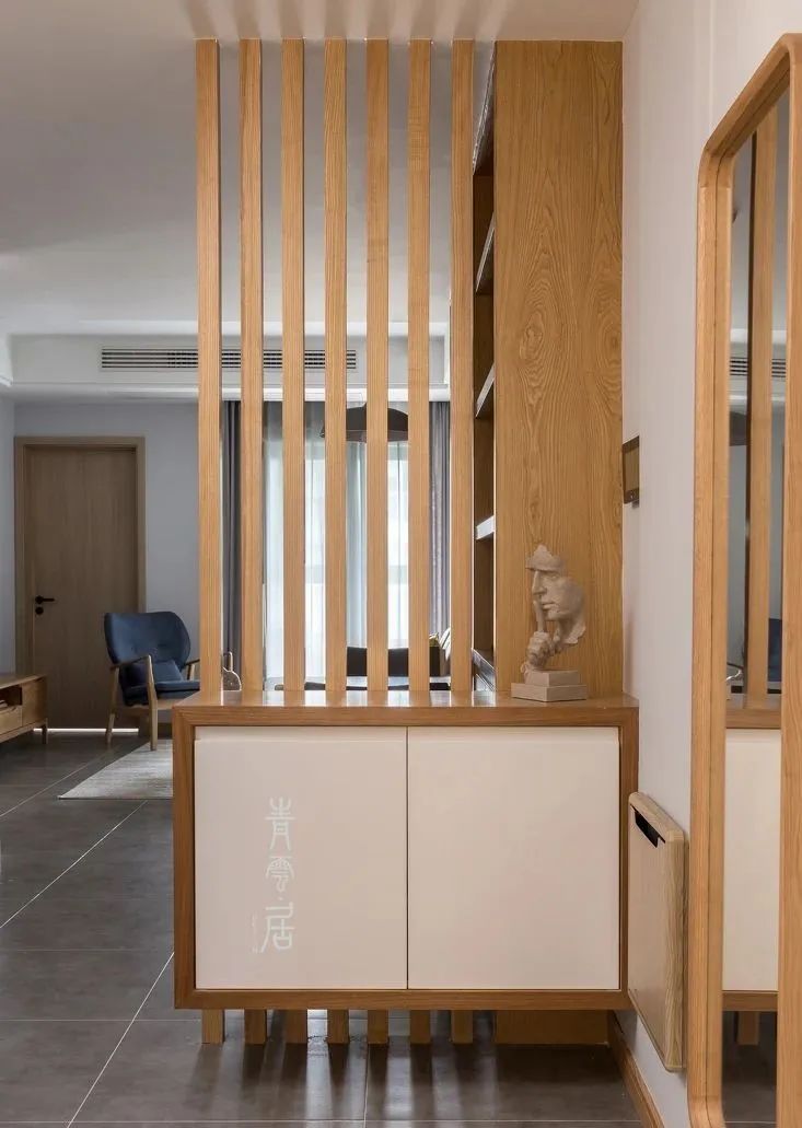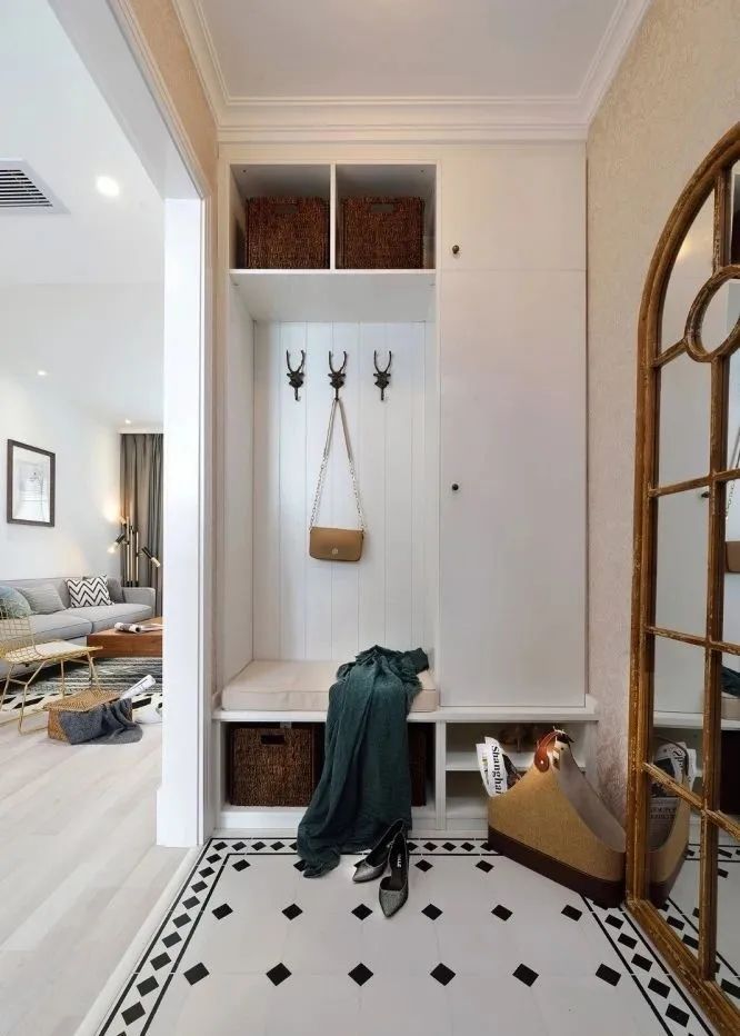 自己创造一个玄关区域,比如在入口区域做一个隔断,**有鞋柜的功能。隔断的风格要和家里的装修风格融为一体。