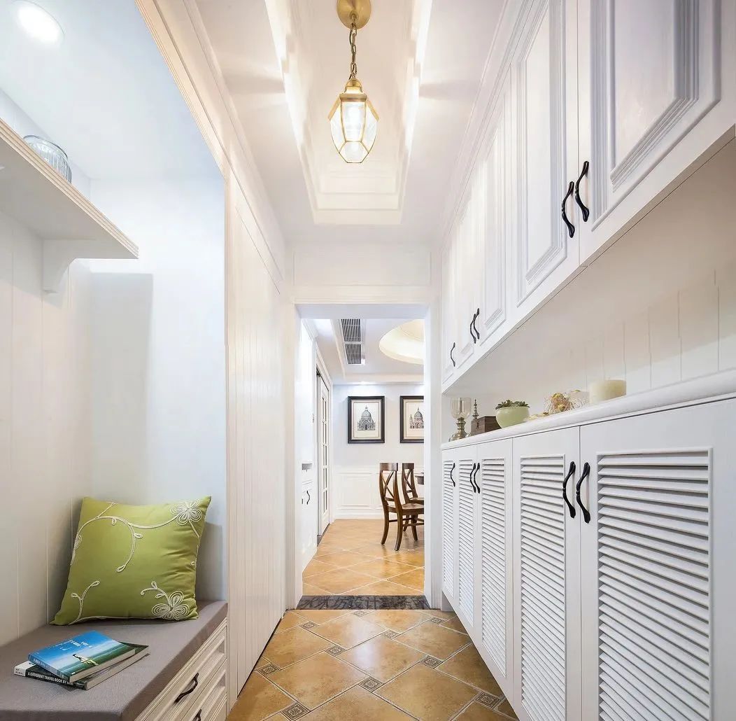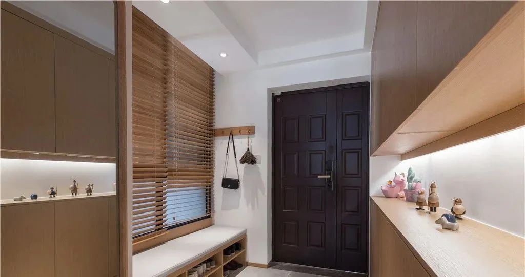 有一个带花园的房子,空间足够宽敞,可以做一个L型或者U型的柜子。除了基础鞋。还可以设计衣帽柜、装饰柜等。,甚至腾出一块地方做杂物箱,把所有的家庭杂物都放在门口。