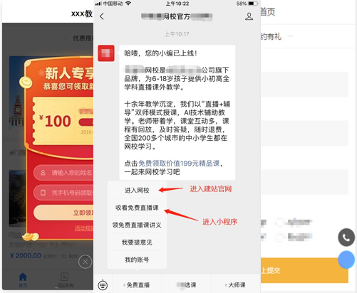 某网校在2003年开始进军教育行业,主攻课外辅导,为了突破地域的限制,降低公司运营成本,在国内互联网异军突起的时候,抓住先机,改变单一的线下教育模式。利用PC端、手机端、以及小程序等页面展示公司实力,课程信息,师资力量等,吸引不同端口的流量,从而获客引流。