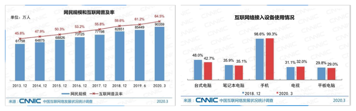 截至2020年3月,我国手机网民总规模达9.03亿,较2019年底增长4910万,这个数据且不断地持续增长中。网民使用手机上网的比例达99.3,较2018年底提升0.7个百分点;使用电视上网的比例为32.0;使用台式电脑上网、笔记本电脑上网、平板电脑上网的比例分别为42.7、35.1和29.0。