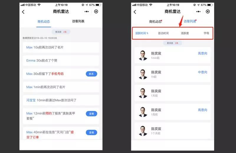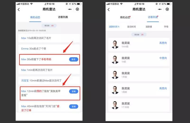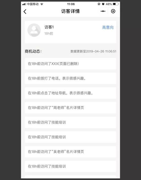 ○ 商机动态中包含访客的名称及访问实时动态,时间是从近到远的排序,其中用户最有价值的行为是有红色标记的,比如留下了手机号码、预约了服务、提交了表单等。