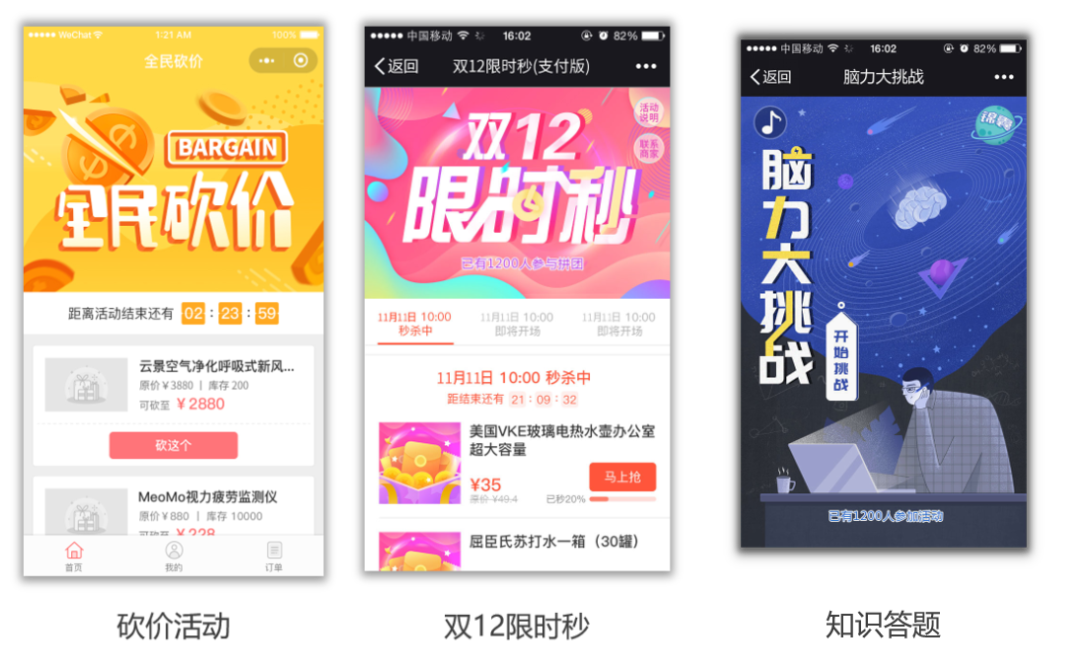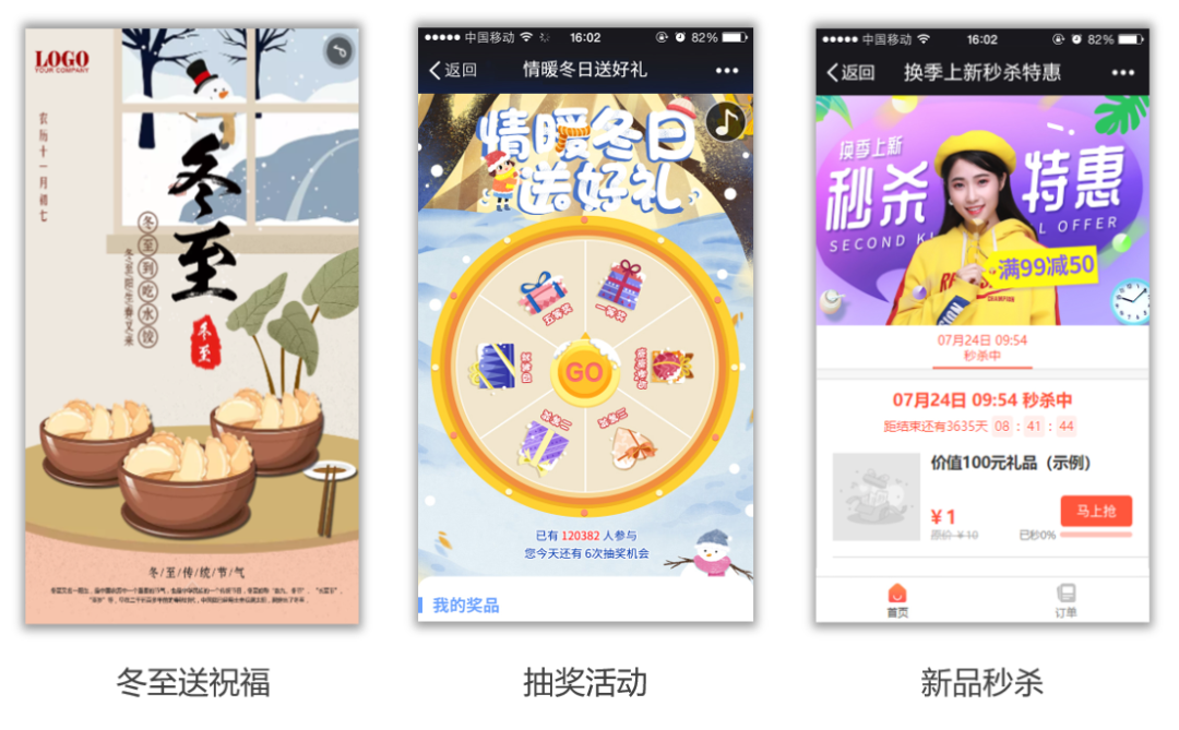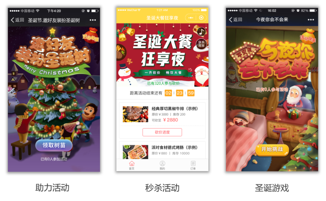 主打圣诞聚餐主题,结合游戏抽奖/助力玩法,以免单、优惠券等吸引用户参与;或结合秒杀玩法,小程序参与圣诞大餐秒杀活动,用户可低价享受大餐。