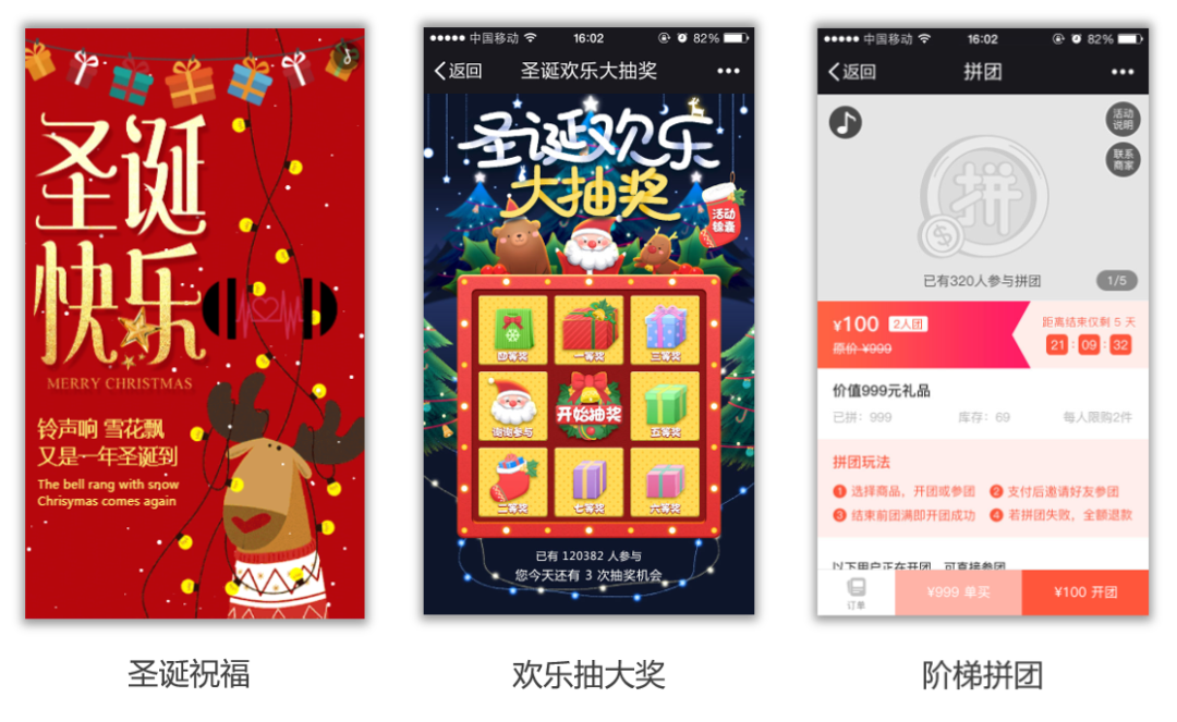 借势圣诞节,主推圣诞限定款商品,结合拼团/秒杀玩法,进行商品促销。