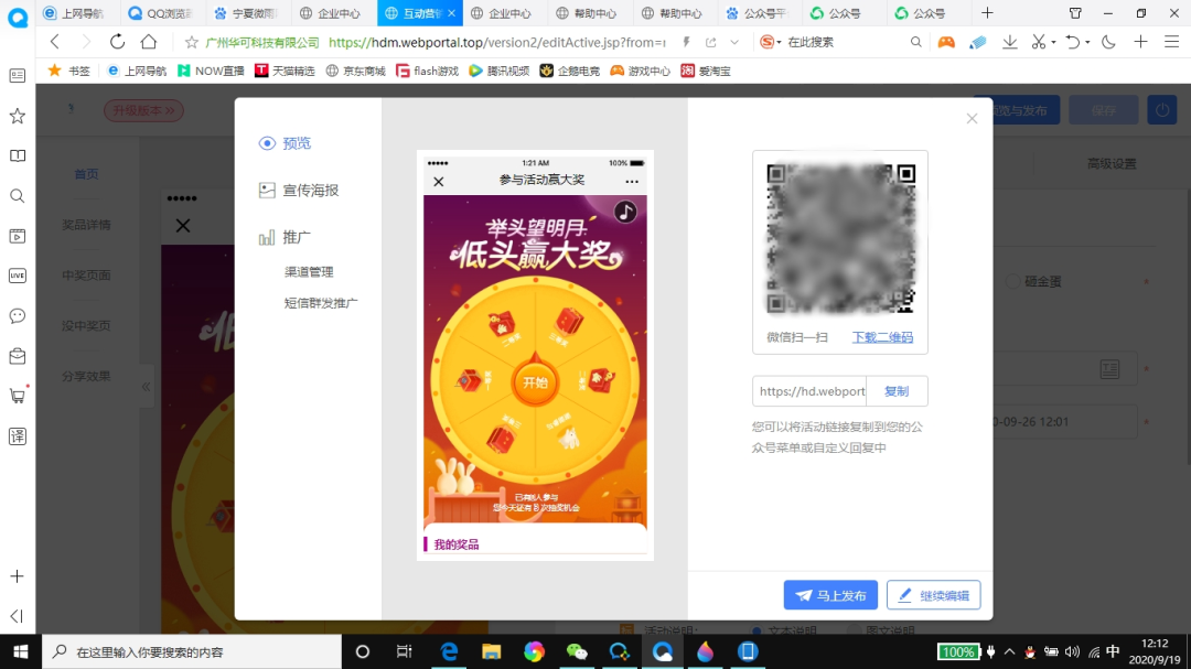 点击右上角的“保存”按钮,或者可以选择“保存并且预览”,点击保存并且预览之后会弹出窗口可以获取活动游戏的链接和二维码。