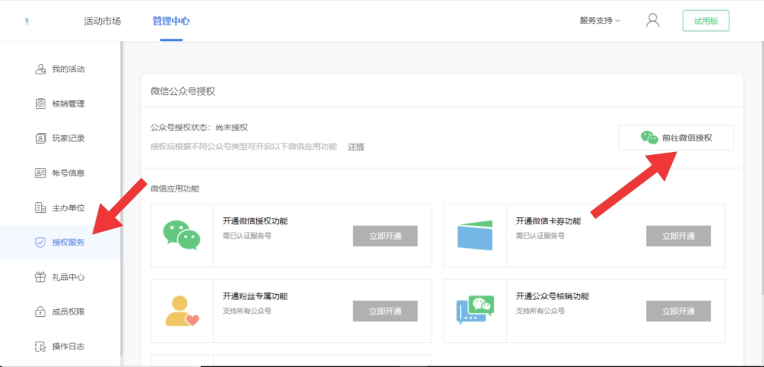 1.进入“进入互动营销”--进入“管理中心”--授权服务“即到微信授权”