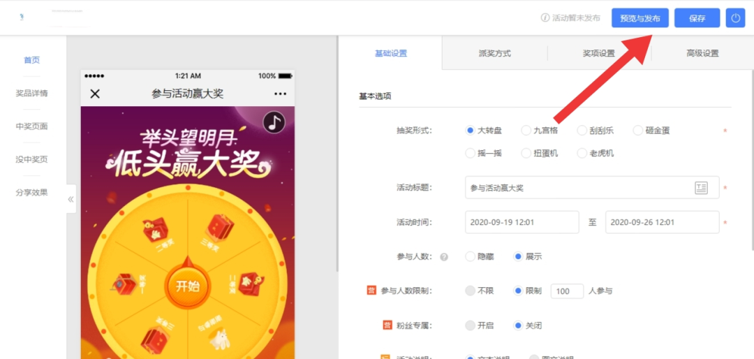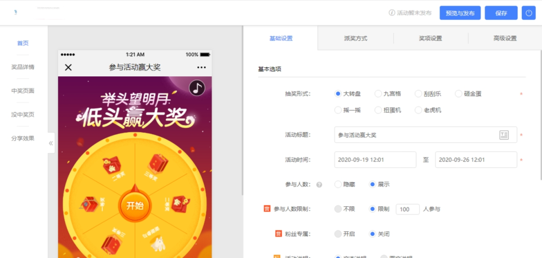 三、进入“基础设置”--设置(标题、活动时间、参与人数、参与人数限制(高)、活动及兑奖说明。)