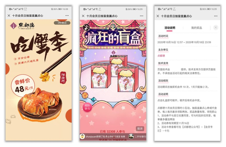 开启组队参与功能,三人成队,队内成员可额外增加一次抽奖机会;点心券或代金券仅适用于点都德门店堂食,有利于实现门店引流。