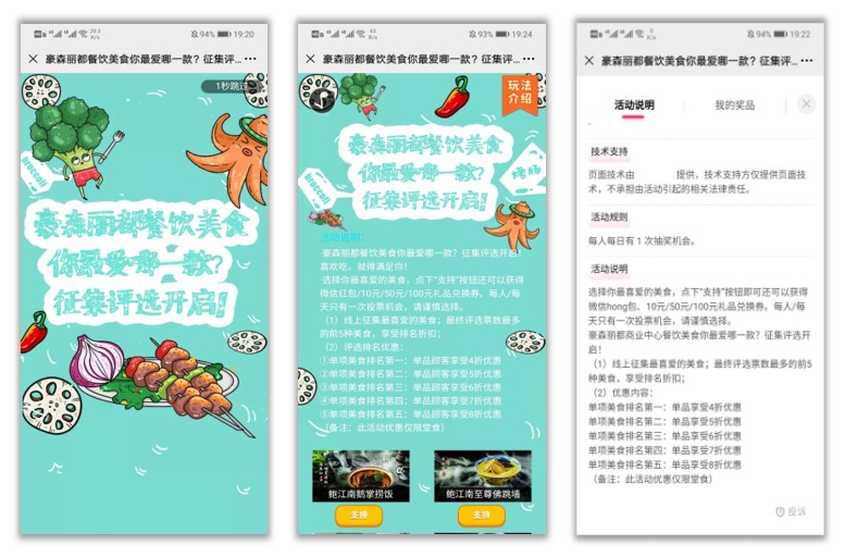 参与投票不仅可以获得微信红包、10元/50元/100元礼品兑换券,还有机会获得美食单品折扣优惠,吸引用户参与;设置线下兑奖,抽中礼品需到现场联系工作人员兑换,并且单品优惠**堂食,有利于实现线下引流。