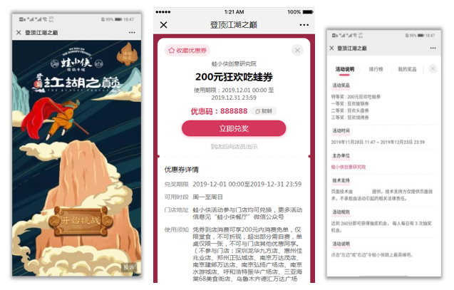 设置大额门店优惠券以及特定菜品优惠券为奖品,吸引玩家参与游戏;分享给好友或朋友圈,玩家当天将额外获得1次抽奖机会;优惠券仅适用于蛙小侠参与活动门店堂食,有利于实现门店引流。