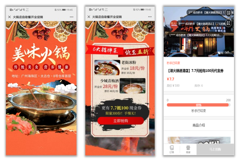不仅有折扣优惠,还能限时低价秒杀百元现金券,优惠力度大,吸引用户参与;设置线下兑奖,用户到店消费后才能使用现金券抵扣,有利于门店引流。