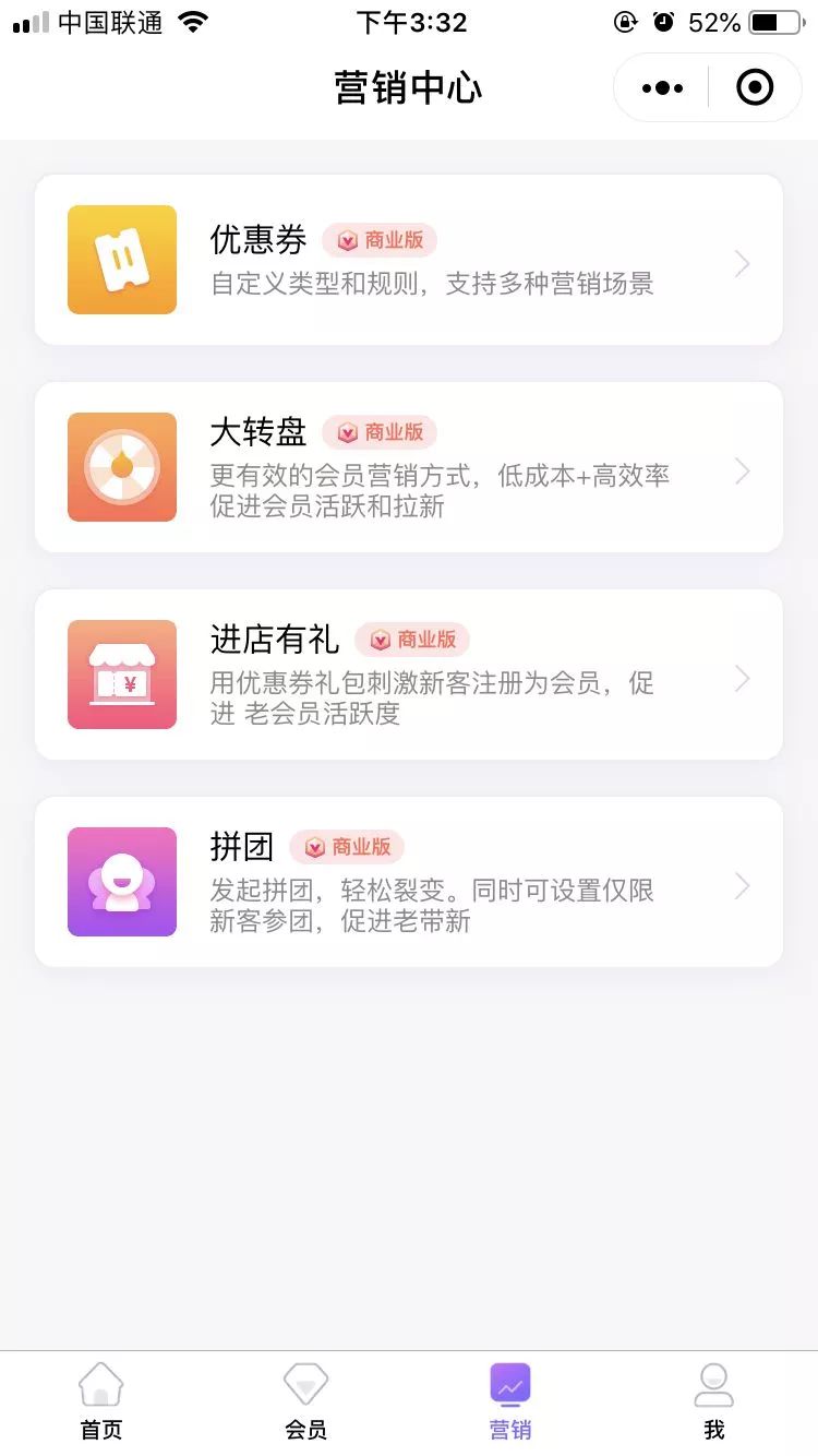 同时,门店系统还有更多实用营销功能,如:拼团、进店有礼、大转盘,全方位多角度助力商家开启财务之路。