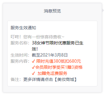 化妆品A公司利用公众号助手,可以定向给女性粉丝推送女神节优惠、订单物流信息、节日问候等内容,让消费者便捷地了解到一手最新资讯,保持紧密联系!提升复购机会。
