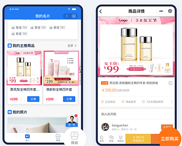 化妆品A公司的销售顾问,利用销售系统完善自己的个人名片,支持设置跳转以上的商城&轻应用小程序,帮助A公司快速传递公司的产品信息,高效打造品牌氛围,一举两得。