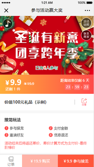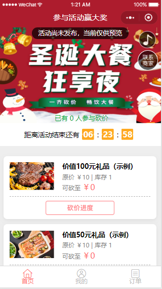 2.结合秒杀玩法,小程序参与圣诞大餐秒杀、砍价活动,用户可低价享受大餐优惠。