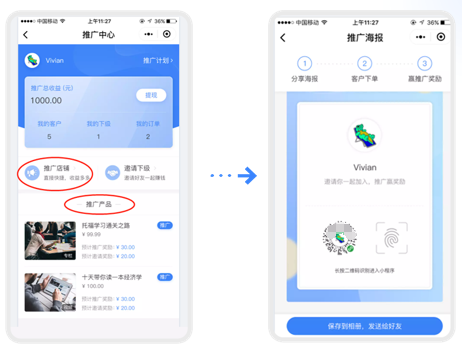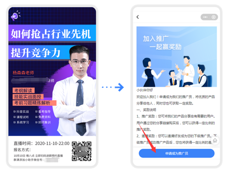 b.申请通过后,进入推广中心学员,点击“推广店铺”或者推广“产品”;系统一键生成推广海报,学员可直接发送海报给好友报名。