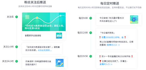 针对48小时内活跃粉丝提前设置好内容,当粉丝触发发送规则后,立即推送,及时转化粉丝