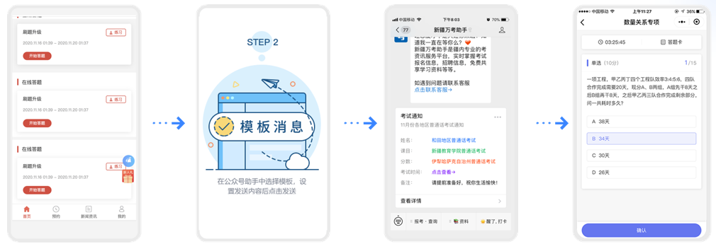 使用教育系统新建免费“答题活动”,公众号助手关联小程序“答题活动”,群发全部粉丝,感兴趣的粉丝点击消息进行答题。