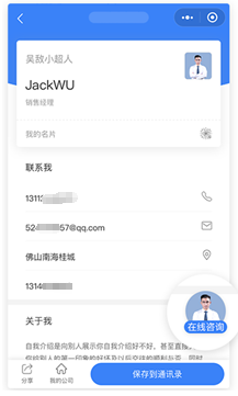 制作智能名片,绑定业务老师微信,嵌入品牌资讯,增加品牌曝光。