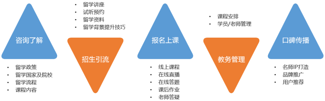 然而发展中也免不了会面临一些难题,其中留学类教育机构主要为:学员管理沟通成本高,信息传达不及时;宣传推广形式单一,招生引流效果受时间节点影响较大;涉及国家政策、院校、师资资源等问题,用户激活时间长、决策成本大,依赖品牌口碑。