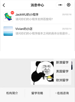增加在线咨询功能,通过名片点击在线咨询,快速和业务老师沟通,及时了解留学资讯。