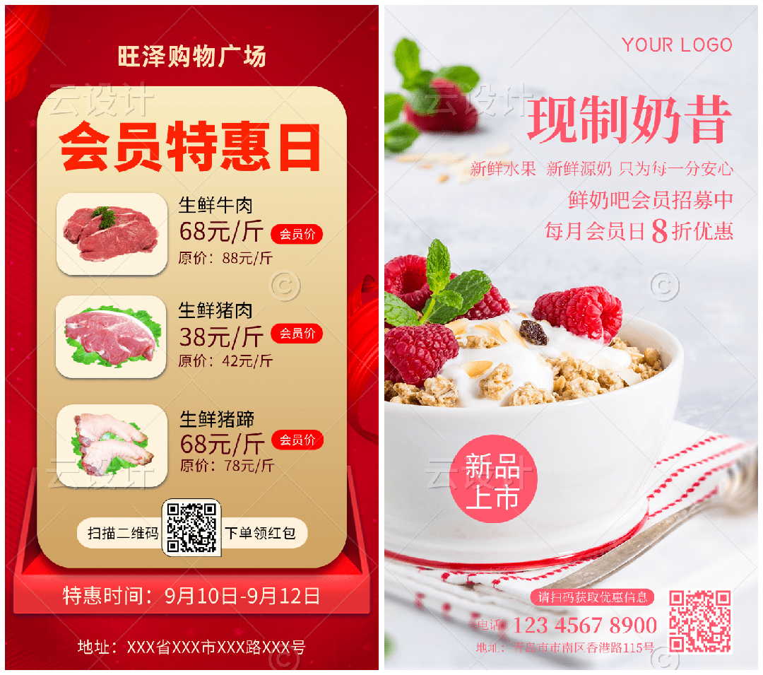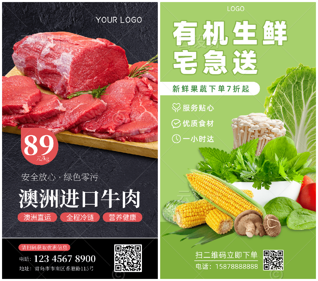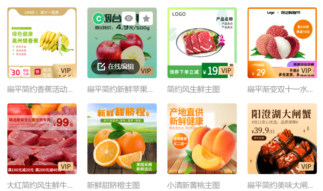 △生鲜商家还可以利用雨科网云设计制作精美的宣传海报,无需懂设计,无需懂代码,商家也能在极速的时间内搭建出媲美“盒X”“千鲜X”的线上生鲜商城
