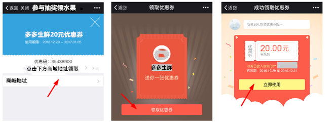 △互动游戏奖项设置非常灵活,商家可以把奖品设置为“xx元优惠券”,这样消费者中奖后,便可通过点击商城地址进入到领取页面了,领取的优惠券会放入消费者的生鲜商城账号,为商城有效引流转化。