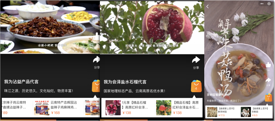 △生鲜商家制作产品视频作导购,以当地政府带货讲解、相关饮食制作等多样视频,搭配当地风景特色,原汁原味呈现商品样貌,并实时滚动推送商品,加快顾客决策购买。