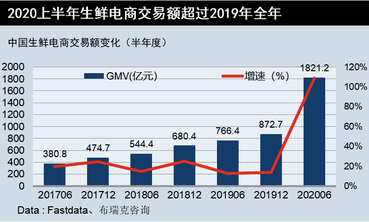 2020年,突如其来的疫情对社会经济造成冲击,而生鲜电商大放异彩,出现爆发式增长。Fastdata极数数据显示,2020年上半年生鲜电商交易额达到1821.2亿元,同比增长137.6%,已超过2019年全年。