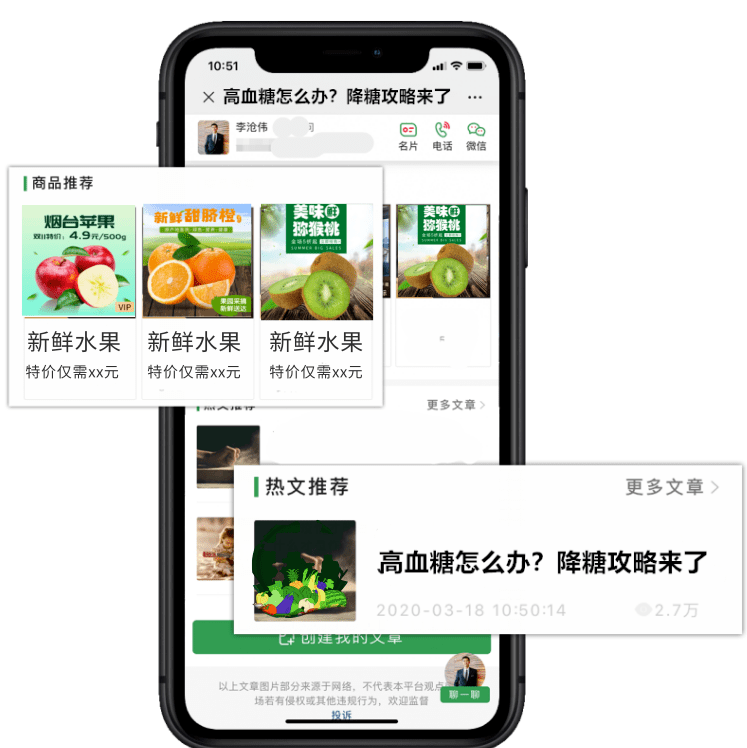 △并且销售系统还有“接入商城”的功能,比如商家在后台选定文章《高血糖怎么办,降糖攻略来了!》,在文尾推荐链接上商城在售的降糖生鲜产品,将会起到很好的种草效果,转化效率自然妥妥提升!