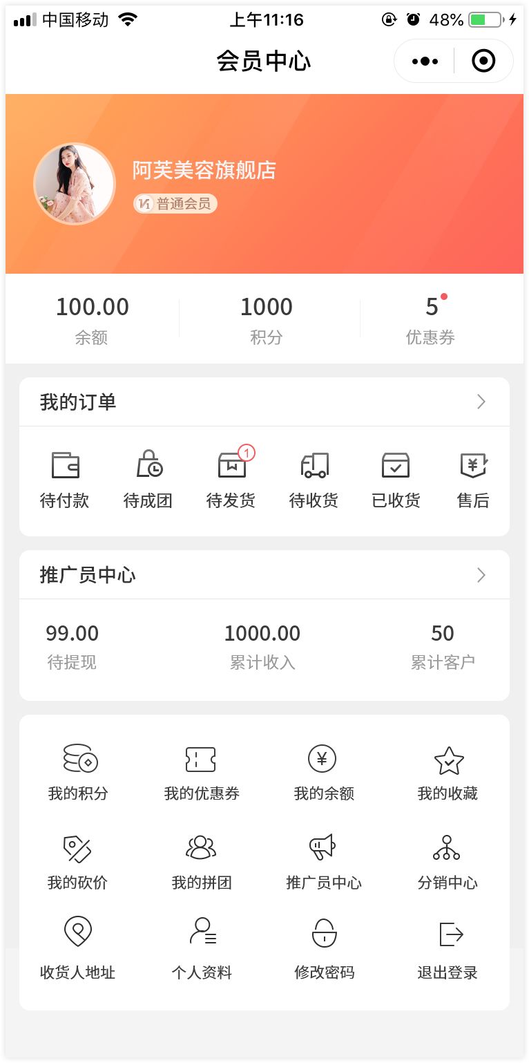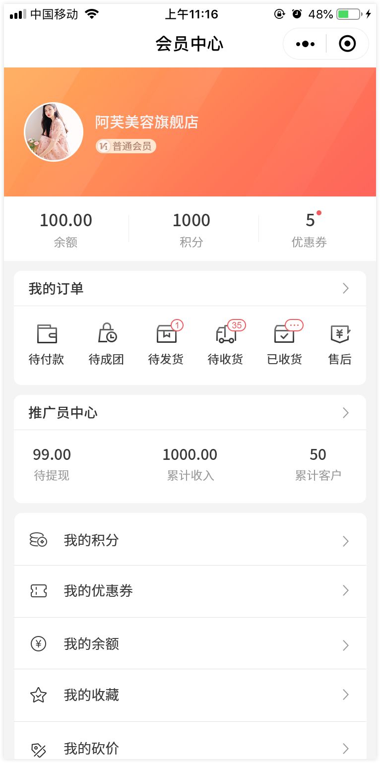 1. 新增会员资产模块(包括余额、积分、优惠券)、推广员中心模块(支持自定义模块名称、显示设置)。