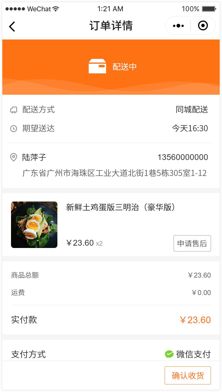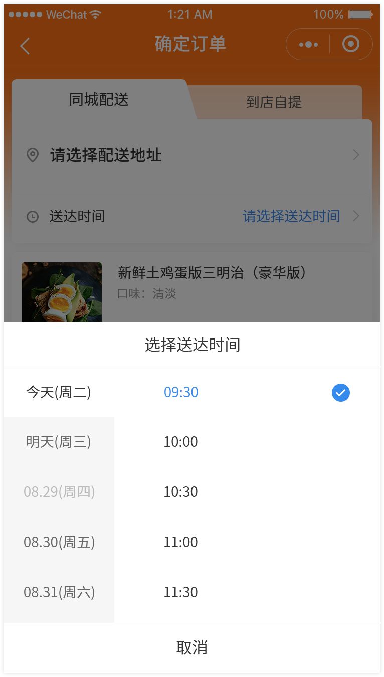 3. 买家在小程序中下单时,若收货地址满足商家配送范围,可选择订单配送方式为同城配送。(PS:定时达功能即将上线,支持买家提交同城配送订单时,选择期望送达的时间)