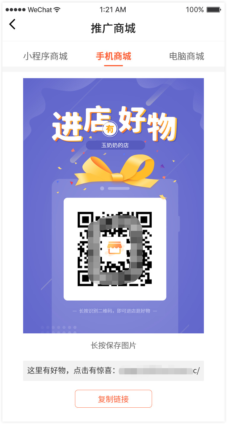 3. 支持在商家助手下载图文海报和链接去推广商城。