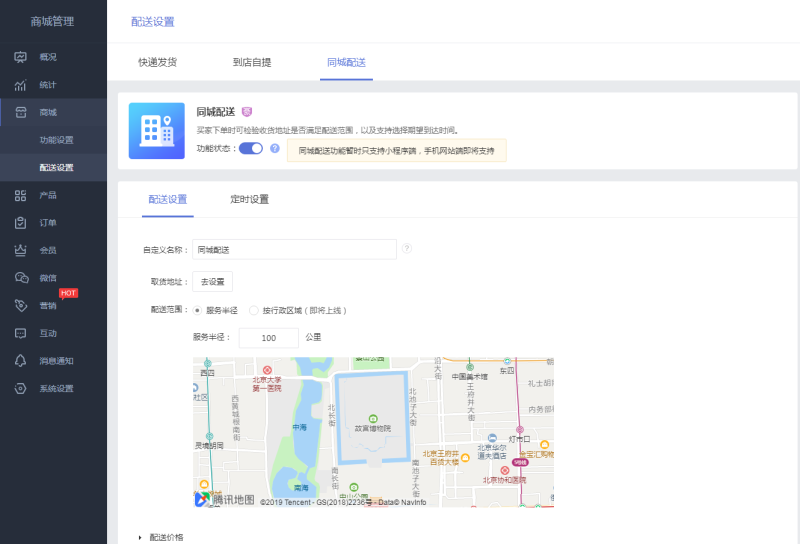 2. 设定取货地址后,可通过自定义服务半径,设置配送范围,起送价和配送费支持自定义。(PS:阶梯价功能即将上线,支持起送距离每增加X元,配送价增加Y元)