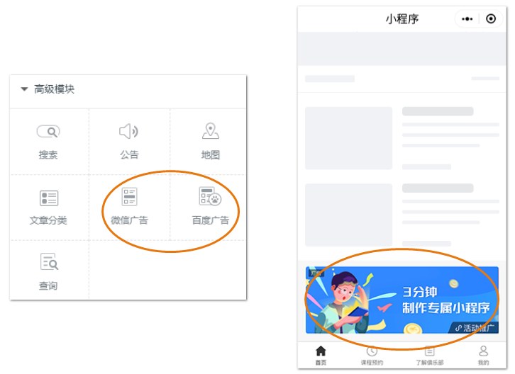 在轻应用小程序中,小程序可以拥有专门的广告位