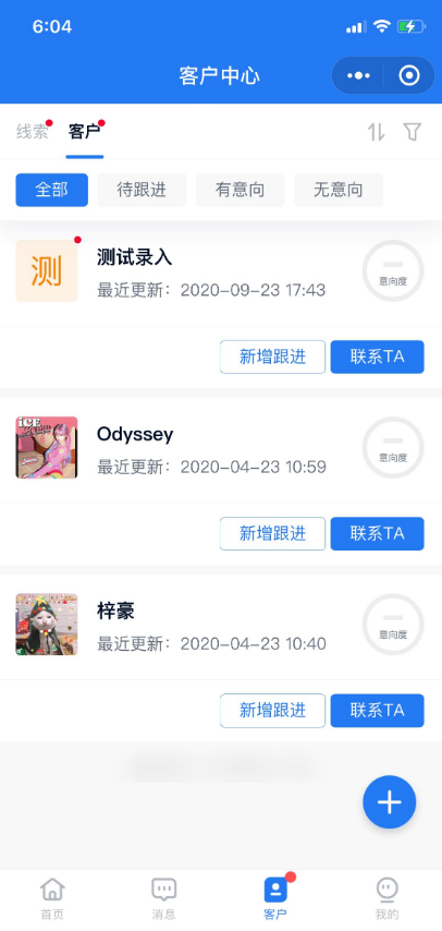 点击小程序页面下侧的【客户】,进入客户中心-客户