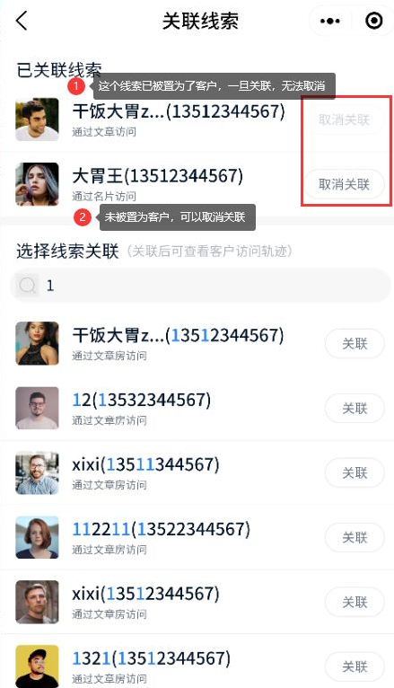 注意:已被置为客户的线索,无法取消关联,按钮将会置灰。