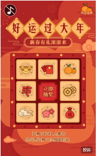 商家通过设置一定的活动门槛,如收集满5张福卡,即可获得抽奖机会1次。用户为了获得抽奖机会,必须通过转发该活动,邀请好友助力,此玩法不仅年味十足,还自带社交属性,有利于商家传播品牌!
